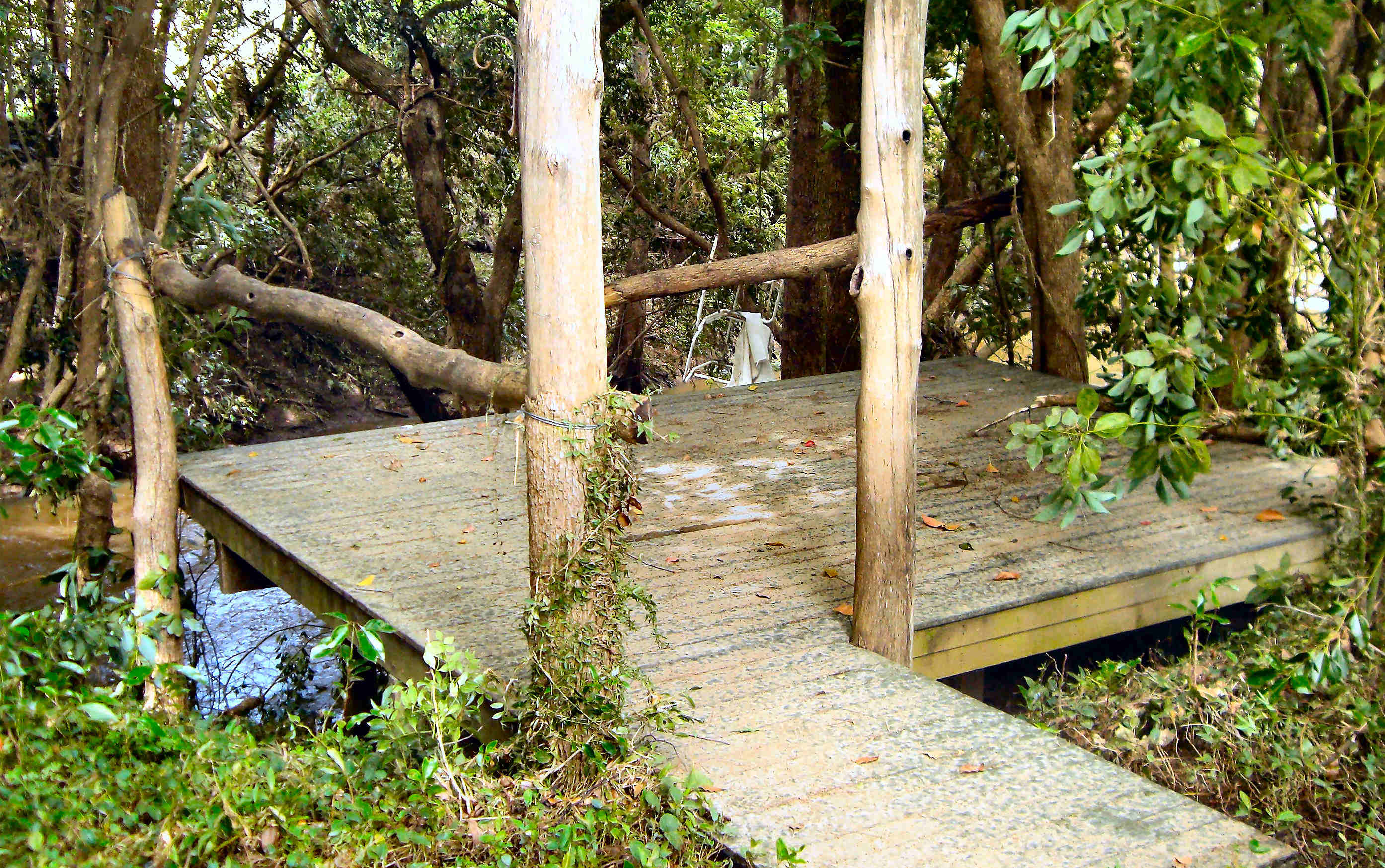 The small deck was stripped of all its furniture, part of which can be seen in the trees below, and the safety railings were smashed as though they were kindling. |