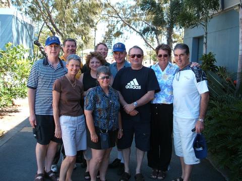 From the left, In blue cap, Bruce (Sudds) Purcell, his wife Chris in the brown top in front of him. At back in yellow top is Arnie Vereschildt, his wife Marilyn is in the black top in the middle. Middle blue cap is Stew Deans and his wife is the lady in the front in the flowery top. Barny Jones is in the Adidas T Shirt. Allan George is peering over the top from the back and his wife Jane is in the blue top. Bloke on the right in white is Phil ‘Tubster’ Laird.